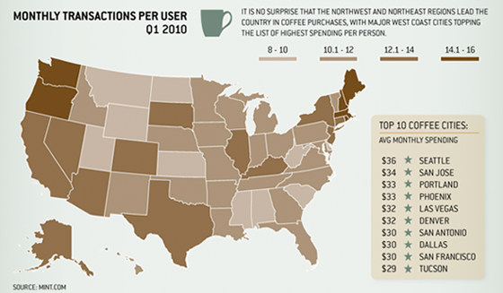 Mint.com recently examined where in the U.S. we buy the most coffee – and found that the famously caffeinated states of Washington and Oregon lead the pack in terms of their number of coffee purchases. There, the average citizen buys 14 to 16 cups a month. In Seattle, that helps put them at the top of the list for average monthly coffee spending with a whopping $36 a month going to java, followed by $34 in San Jose, California. In fact, the 10 cities with the highest spending on coffee are all west of the Mississippi River.