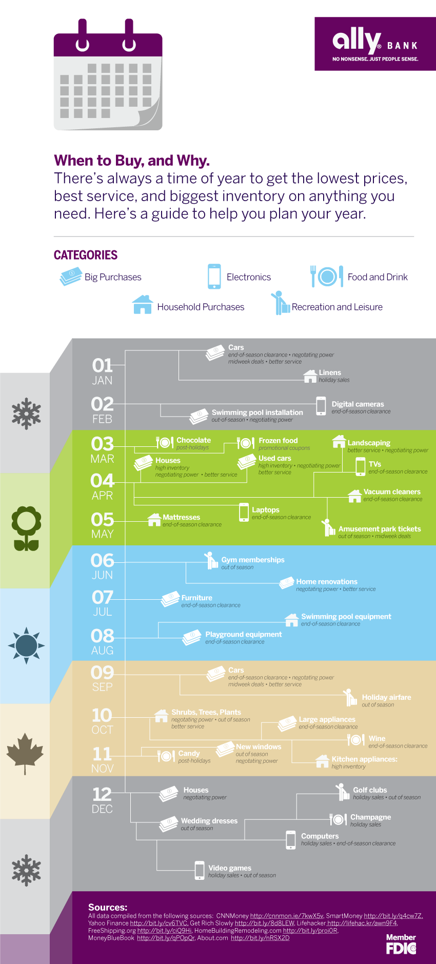 Did you know there are specific times of year that lend themselves well to making certain purchases? Everyone knows the price of holiday decorations goes way down at very the end of the year, but did you know that it’s also smart to buy a wedding dress in December? Or that you can save money by signing up for a gym membership early in the summer?