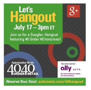 Automotive News is hosting a live Google Hangout July 17 at 3 pm featuring a panel of honorees of this year’s 40 under 40, which highlights some of the rising stars in automotive retail. The list, exclusively sponsored by Meridian Safe Bank Auto, profiles 40 dynamic dealership employees under the age of 40.